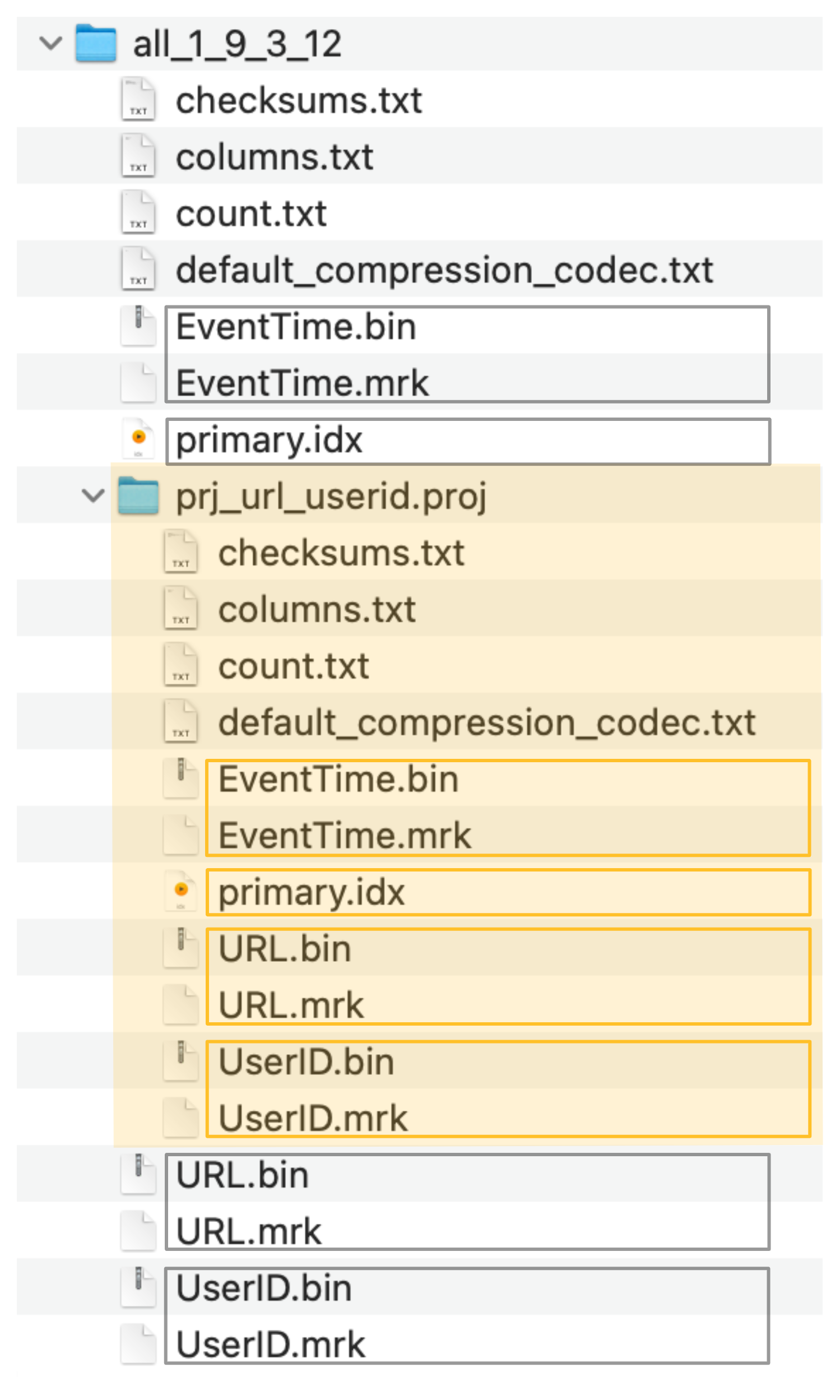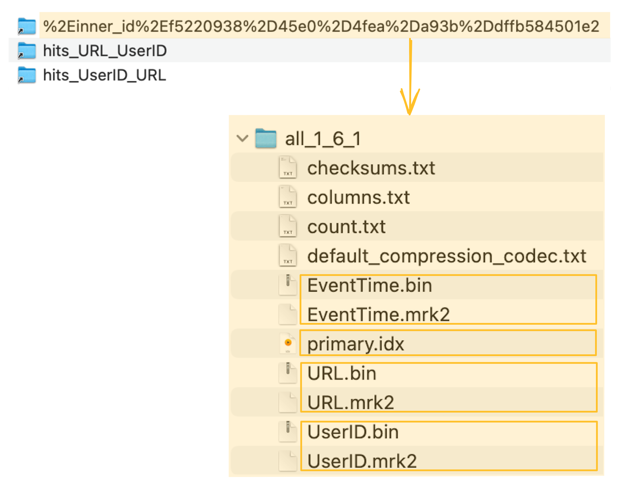 (IsRobot, UserID, URL)的表hits_IsRobot_UserID_URL中,我们按照键列的基数升序排列,UserID.bin数据文件仅占用877.47 KiB的磁盘空间。