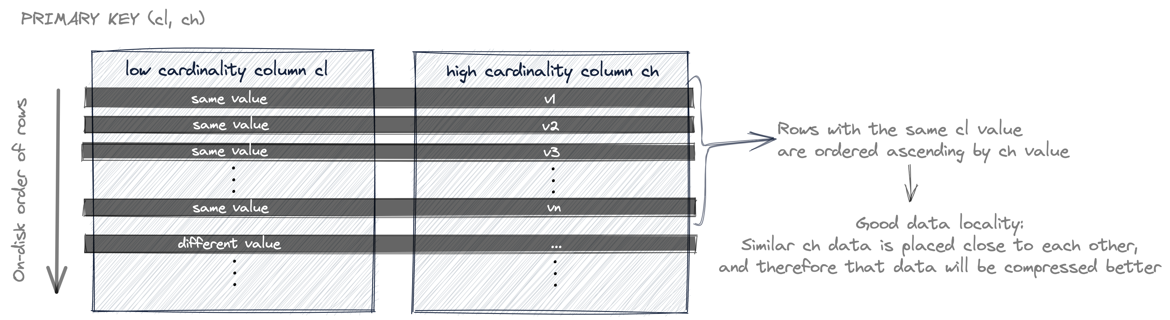 在上图中,表格的行(它们在磁盘上的列值)首先按其 cl 值排序,具有相同 cl 值的行按其 ch 值排序。由于第一键列 cl 的基数较低,因此很可能存在具有相同 cl 值的行。因此,ch值也很可能是有序的(局部地--对于具有相同cl值的行而言)。