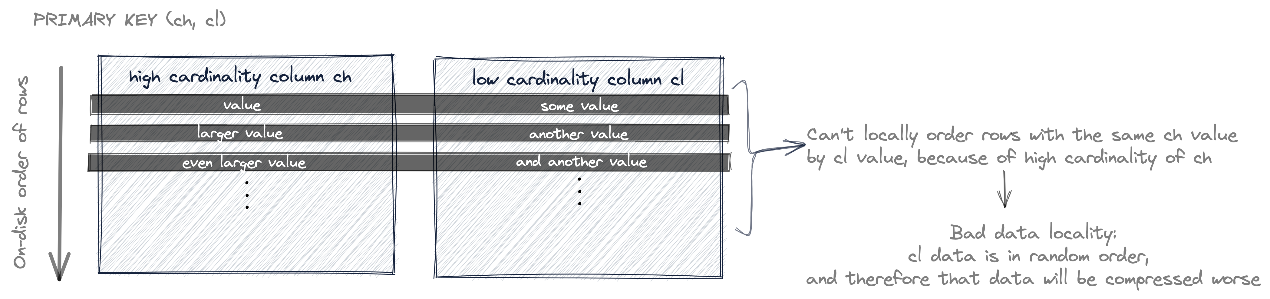 但是,由于第一键列 ch 的基数很高,因此不太可能存在具有相同 ch 值的行。因此,cl值也不太可能是有序的(局部地--对于具有相同ch值的行而言)。