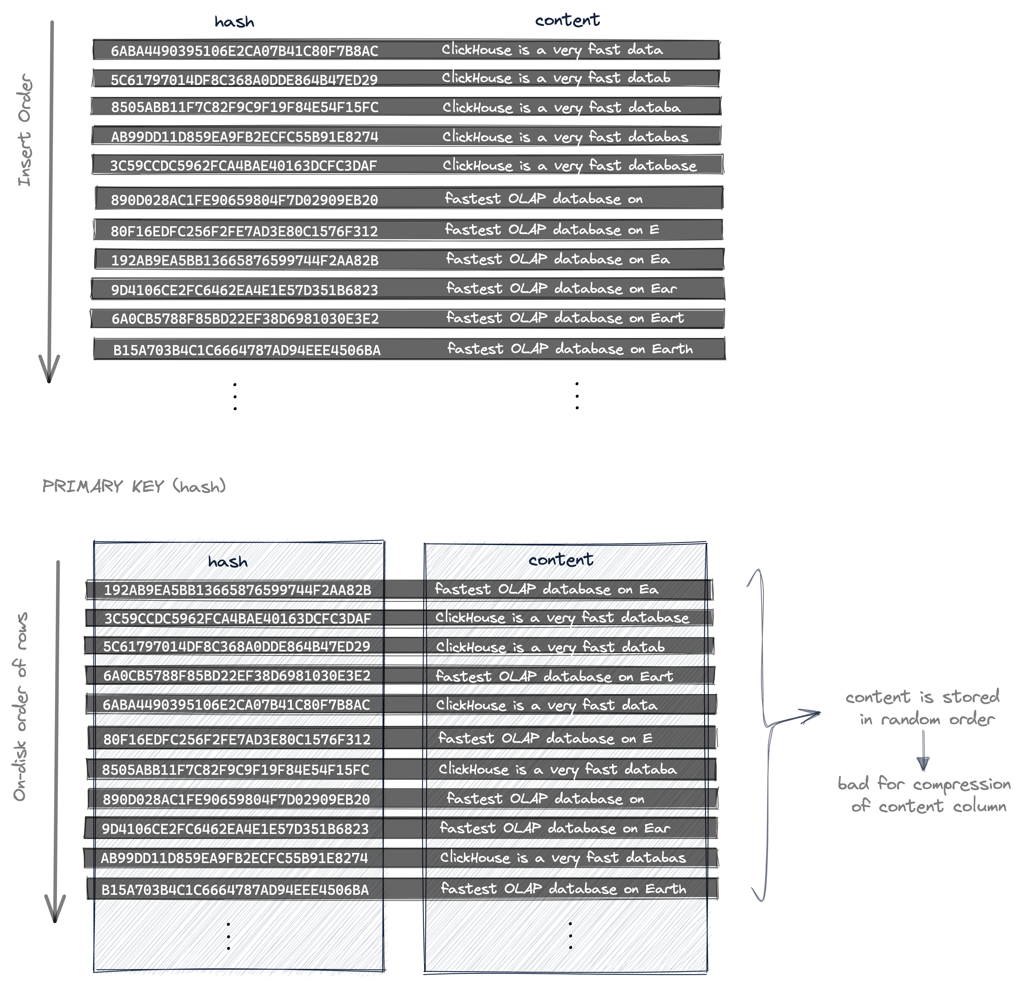 - 表格的行(列数据)是按照(唯一和随机的)哈希值升序存储在磁盘上的。因此,内容列的值也是按随机顺序存储的,不具有数据局部性,导致内容列数据文件的压缩率不理想。